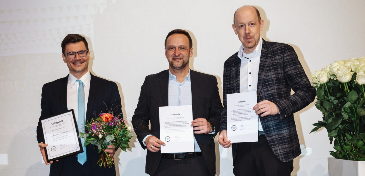 Teaching Award for Bachelor's in Information Systems: Prize Winner Dr. Johannes Sedlmeir (left) with fellow nominees Dr. Adam Widera and Prof. Christian Grimme.