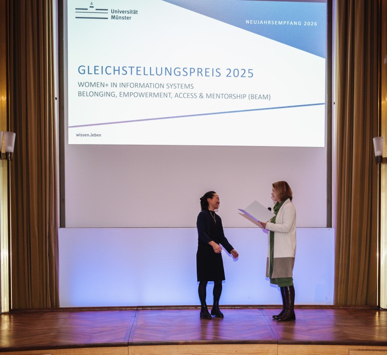 The project “BEAM” (Belonging, Empowerment, Access & Mentorship), part of the Women+ in Information Systems Initiative, was awarded the 2025 Gender Equality Award at the New Year’s Reception of the University of Münster. The prize is awarded every two years by the Rectorate and recognizes projects that make an outstanding contribution to equal opportunities and gender equality.